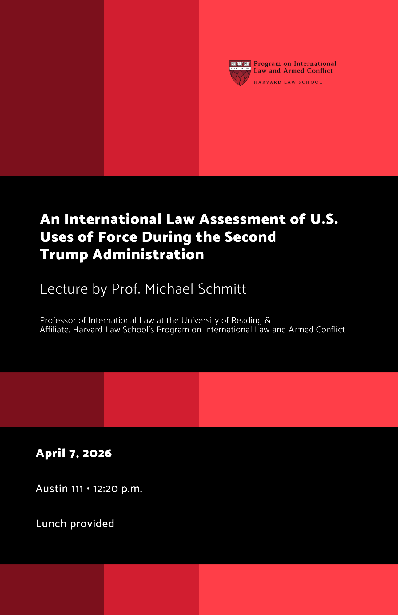 In this lecture, Prof. Michael N. Schmitt (of the University of Reading and an HLS PILAC affiliate) will examine selected United States uses of force during the second Trump administration through the lens of international law. He will pay particular attention to the legal bases advanced for those operations and their relationships to relevant frameworks, including the jus ad bellum, the jus in bello (international humanitarian law/law of armed conflict), and international human rights law. Drawing on specific episodes across the administration, Professor Schmitt will assess whether those operations may be regarded as lawful under international law.